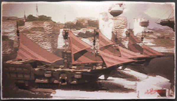 探検手帳「バラクーダ埠頭」のスケッチを模写した風景画
